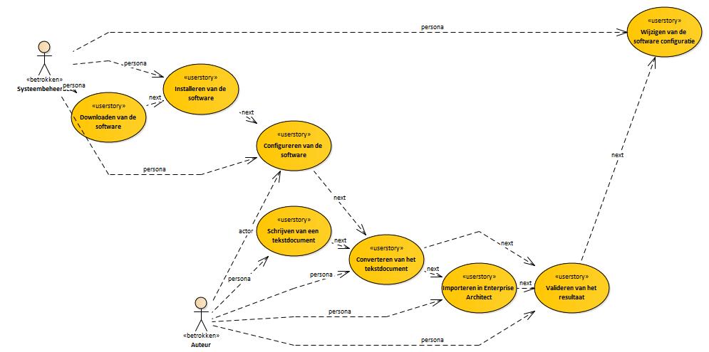 - Valideren van het resultaat. De auteur valideert het resultaat. Vaak is een document niet in een keer goed en moet de auteur het tekstdocument aanpassen. Converteren van het tekstdocument is gereed. Importeren in Enterprise Architect maakt het valideren makkelijker.